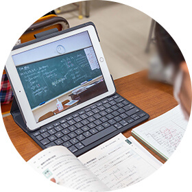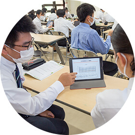 数学を教える高等部文理科の科長、明日山浩行教諭は、鹿児島県内のICT教育先進校の数学の授業を見学し、文理科の授業スタイルを変える取り組みを始めた。授業の前半25分を演習、後半25分を講義に分けるスタイルだ。「25分で完結すると分かっていると生徒も集中して聞いてくれる」と、明日山教諭は話す。これまで50分のほとんどを要していた講義を25分に短縮できているのは、生徒がノートをとる時間を削減したことが大きいという。ノートをとる代わりに、タブレットのカメラで黒板を撮影し写真に残す。これにより、書く時間の削減だけでなく、生徒は完全に聞くことに専念できるのだ。そして、授業前半の演習で、これまでに習った公式などを使う復習を行う。このときにも、2年前に習ったことでも、タブレットには黒板の写真が保存されているので見返すことができるという利点もある。明日山教諭は、「文系の生徒のなかには数学が嫌いという生徒が多かったが、授業スタイルを変えてから、嫌いと言われることがかなり減った」と話す。これまで以上に理解度が上がっている証拠と言えるだろう。