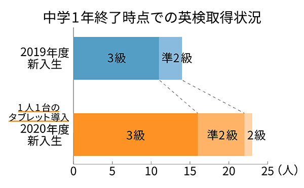 2020年度から、オンライン英会話と、海外の本の読み放題サービスXreadingを導入した。オンライン英会話は、外国人と1対1で毎日25分レッスンを受けられるサービス。生徒は家庭学習として取り組み、「聞く・話す」に特化した生きた英語を養っている。そして、Xreadingは、まず英語の幼児用絵本から読みはじめ、朗読音声も聞く。これをほぼ毎回の授業で20分ほど行っている。友田哲平教諭(英語)は「最初は1ページに1文しかないような絵本からスタートします。読みながら聞いて、内容がわからなくても調べない。絵の表情などから推測するということをたくさんやっていった結果、生徒は聞くこと話すことに関して貪欲になり始めました。1人1台のタブレットで手軽に取り組めるようになって、生徒はさらに伸びるだろうと思っています」と話す。Xreadingは、生徒がどのくらいのスピードで読んだかの確認や、クイズを設定し理解度を確認することもできる。そして、生徒各自が違う絵本を読むことになるため、おすすめの絵本を紹介するスライドをロイロノート・スクールで共有するなど、楽しみも取り入れながら進めているという。友田教諭は「みんなが楽しく取り組み、結果が結びついてくれば、より好循環が生まれるだろう」と話す。実際に中学1年終了時点での英検取得状況を見ても、いい結果が出ている。