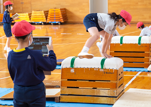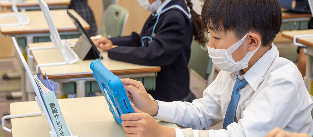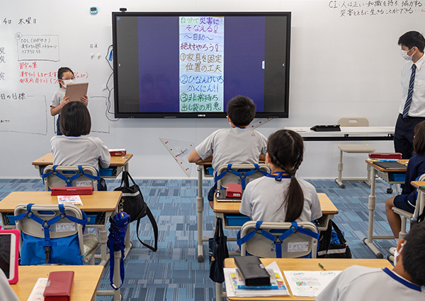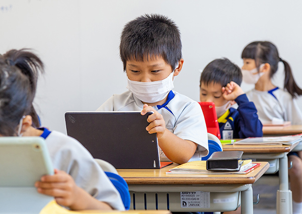 2020年度から導入されている児童1人1台のタブレットとともに、教育にICTを取り入れる理由について末吉理事長は「今の学力観で重要とされているのは知識・技能の習得よりも、思考力・判断力・表現力をつけることです。しかし、知識・技能を怠っては学力の低下につながってしまいます。教員が知識・技能の情報提供に50分かけていた時間を25分に短縮し、児童が思考や表現にかける25分を作ることが、ICTを導入した最大の理由です」と話す。ICTを活用し、板書などにかけていた時間を省略することで、これまでよりも短い時間で多くの情報をインプットすることができ、さらに、演習・ディスカッション・プレゼンテーションといったアウトプットまで取り組む時間も確保している。