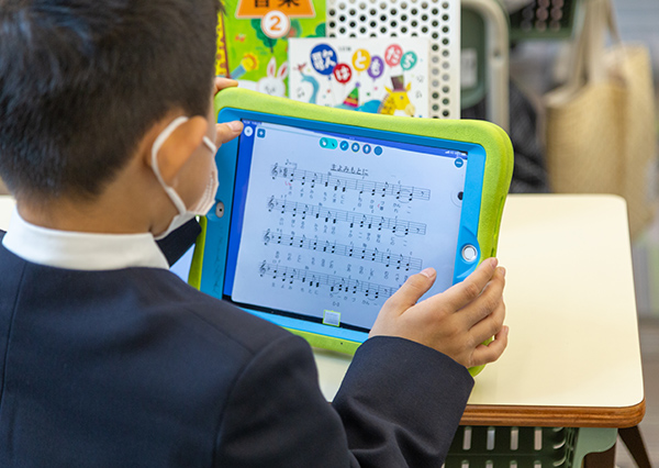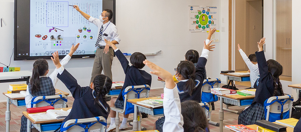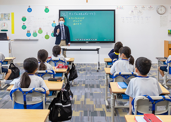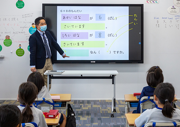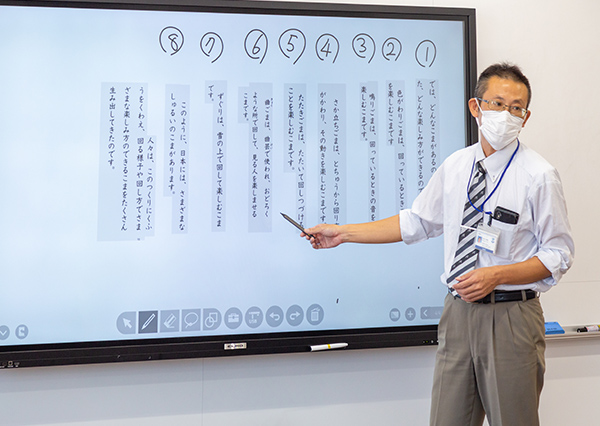 プライマリー・ステージでは、国語の基礎力を高めることに特に注力している。小学2年の国語の授業では、教員が電子黒板にデジタル教科書の文章を表示し「この段落の中心文はどこですか?」と児童に質問していた。段落ごとに中心文を抜き出していくと、わずか数分で文章の要点がわかっていった。国語の教員でもある末吉理事長は「以前は、模造紙に長い文章を書いておき、中心文をはさみで切りとり、それをつなぎ合わせて見せて『100字で要約してください』と、大変ですけど大切だと思ったのでやっていました」と話す。