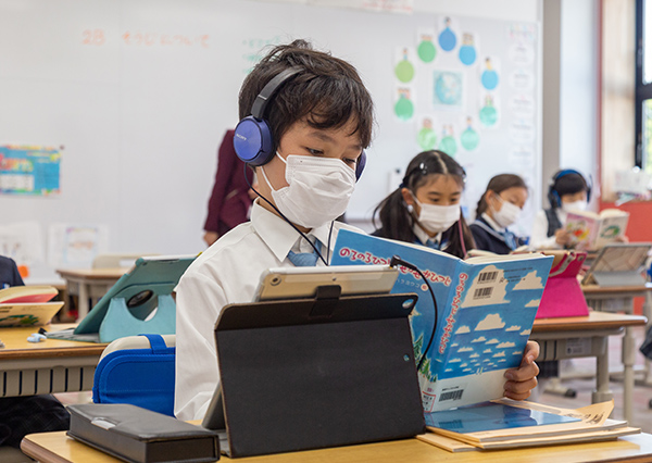 もう一つの国語の授業では、ヘッドホンをした児童1人1人が、タブレットの音声を聞きながら文章を読んでいた。これは、児童の黙読スピードを上げる目的で行っている「読むとくメソッド®」という学習塾などで使われている学習システム。朗読音声を聞きながら文章を目で追っていき、徐々に音声のスピードを上げることで黙読スピードを鍛えていくためのもの。慣れてくると、早い児童だと3倍速の音声でも文字が追えるようになり、本を読むスピードの向上につながっていくという。末吉理事長は「私が気に入って取り入れました。読み聞かせと同じ手法で、2年生までに黙読スピードを育てることが狙いです。本をちゃんと読む子を育てることが重要です」と話す。この取り組みが、理解力や集中力などの向上に役立ち、本を読む力が全ての学習へとつながっていくという。
