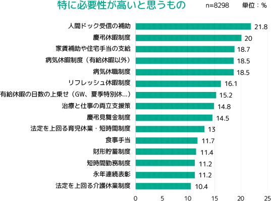 「福利厚生の充実」が採用に与える影響は年々大きくなっています。また、「健康的に働くこと」「働きやすさ」への関心の高まりも数字に表れおり、採用活動は「福利厚生」「健康」「働きやすさ」などのキーワードとセットで考えることが肝要です。