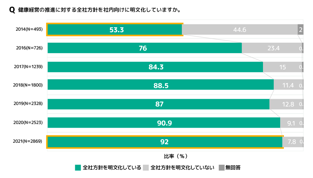 2014年の53.3%から2021年の92%に大幅に上昇。健康経営を重視する企業が増加している。