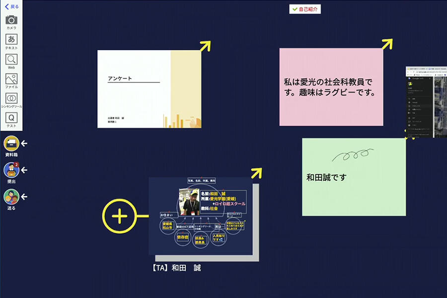 和田教諭が、カードに自己紹介を記入し全員に送信すると、参加者全員が見られる状態になる。提出箱機能を使えば、提出期限も設定でき、参加者が提出した自己紹介を共有すれば、全員がみんなの自己紹介を見ることができる。