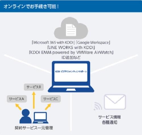 KDDI ビジネスオンラインサポートは、KDDIで提供している「Microsoft 365 with KDDI」「Google Workspace」「LINE WORKS with KDDI」「KDDI EMM powered by VMWare AirWatch」などを一元管理できる無償のサポートサービスです。