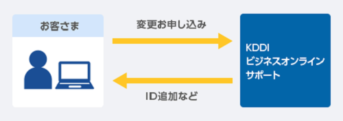 「Microsoft 365 with KDDI」「Google Workspace」「LINE WORKS with KDDI」「KDDI EMM powered by VMWare AirWatch」のご利用ID数の増減を始めとした変更の申し込みが可能です。その他、契約者情報の参照など契約サービスごとにオプションの変更可能な設定もあります。