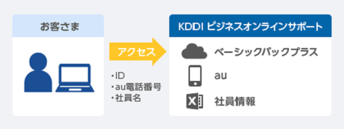 KDDIが他に提供する「ベーシックパックプラス」の対象サービスやau端末管理、社員情報などを網羅的に管理できます。