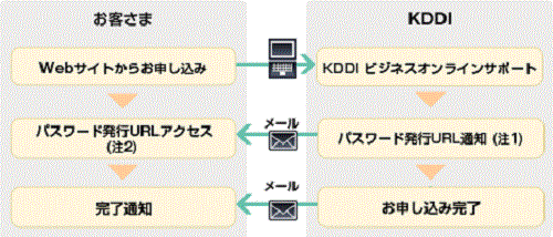 KDDI ビジネスオンラインサポートの申し込みはWebサイトへのご連絡により可能です。Webサイトよりご登録いただくと、翌営業日~5営業日以内にパスワード発行URLをご連絡します。有効期限は1週間ですので、1週間以内にURLにアクセスしてパスワードを発行するとすぐにKDDI ビジネスオンラインサポートをご利用いただけます。