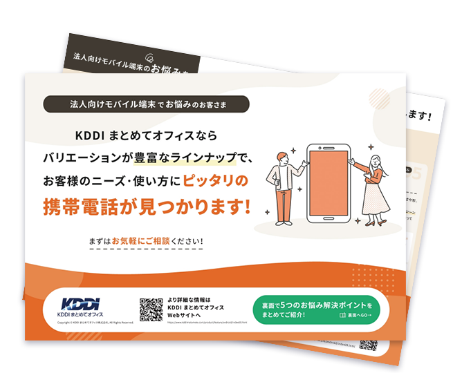 携帯電話の法人契約を検討するなら、KDDI Biz Edgeにおまかせください。KDDIが長年培った高品質でセキュアな通信を軸に、携帯電話やスマートフォンをはじめとした幅広いラインアップをワンストップでご提供し、自社の課題を解決します。法人契約での新規導入、MNPをご検討中なら、お気軽にKDDI Biz Edgeへご相談ください。