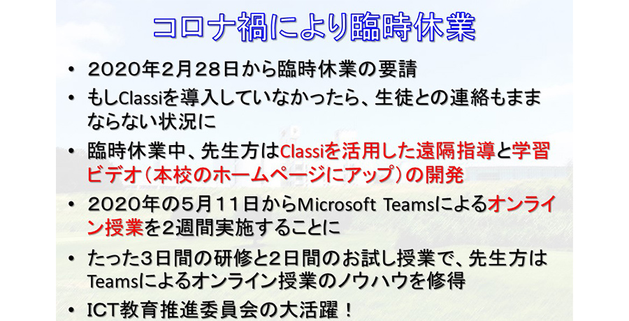 2020年2月末には、新型コロナウイルスの影響により休校となりましたが、Classiで生徒との連絡ができたことが救いだったといいます。生徒が登校できない状況で、教員が、学習コンテンツ教材をアップロードしたり、自前で授業動画・学習動画を制作し学校のホームページに上げるなどして対応。そして、2020年5月からは双方向でできるオンライン授業をMicrosoft Teamsで始めました。これまでの経験により、教員に最低限のICTリテラシーが備わっていたため、ICT教育推進委員会のメンバーを中心に3日間の研修と2日間のお試し授業を行っただけで、円滑にオンライン授業が進められました。その後も、高等部の全教室にもプロジェクターとスクリーンを設置し、Wi-Fi環境も整備。これらの整備により、対面授業とオンライン授業の切り替えがいつでも可能になっています。