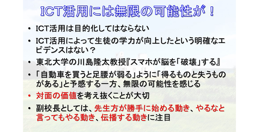 平野副校長は、数学を教える際、ICTを活用するのはグラフや図形の動きを見せるために便利なアプリケーションを使用するだけで、生徒の前で板書し問題を解くことにこだわっているという。ICTは、授業の中で使用した方がいい場面でだけ使うころがポイントで、ICTの活用を目的化してはならないと話します。また、教育にICTを導入するにあたり、懐疑的な考えもあることを紹介したうえで、それ以上に無限の可能性を感じると話しました。そして、副校長として、過去に自分でプロジェクターを買ってきて使っていた教員の様に、授業をよくするために自ら考えて新しいことに挑戦する姿勢や、また、それがいいものだった場合、自然と別の教員に伝播するようなことが、ICT活用の大きなヒントになっていくだろうと話しました。
