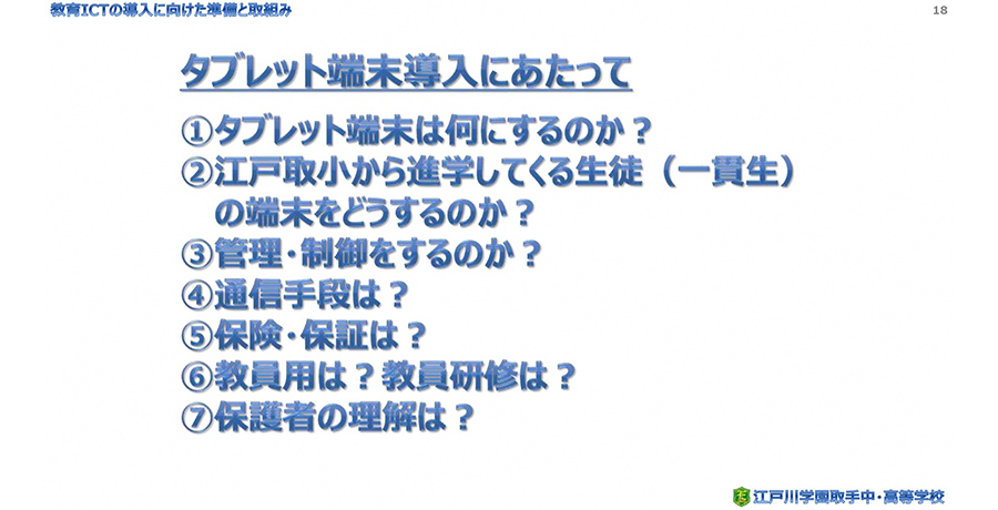 続いて登壇したICT教育推進委員会チーフの金子 真紀教諭は、2019年度の中等部新入生から一人一台のタブレットを導入する際「タブレットは他の文房具と同様、常に自分の側にある学習ツールである」と基本姿勢を定めました。そして、端末を選定や運用・導入していく際に行ったことを、7項目に分けて話してくれました。