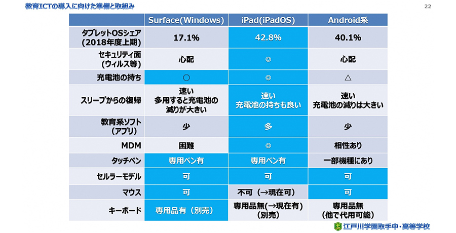 まず、パソコンかタブレットのどちらかと考えたときに、手軽さからタブレットの方がいいのではないかと判断。そして、江戸取小から入学する一貫生は、3年前からSurface(Windows)を使用していました。その端末は、3年前のものなので若干古く、教育系アプリ・ソフトの数が少なく、MDM(モバイル端末管理ツール)によるOSのアップデートやネットワーク・アプリケーションなどの管理が少々面倒で一元管理がしにくいという印象を持っていました。一方、iPad(iOS)は、これまでも共用端末として使用してきていて、教育系アプリが豊富にあることや、MDMによる管理がしやすいという点が好印象でした。また、Android端末については、低価格なものがある点はいいのですが、メーカーごとにカスタマイズされていて制御しにくい面があるのと、セキュリティの面でウィルス感染の危険性など心配な面があるので、運用面でどうだろうと考えました。当時、某出版社が収集した首都圏の私立中高一貫校の調査を見ても、90校のうちiPadが64校と7割以上のシェアであったことなどから、導入端末をiPadに決定しました。