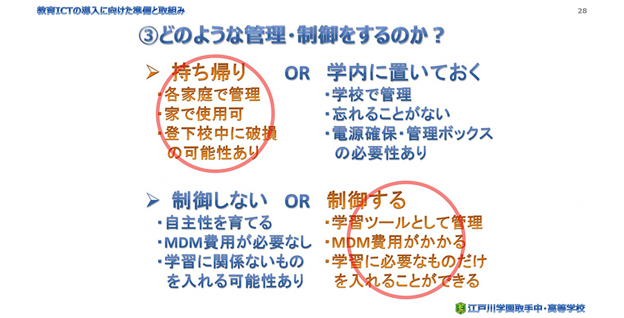 学びを止めないため、使い方に応じた管理・制御方法を考えました。使い方は、学校だけで使うものではなく、持ち帰って家でも使用できるものとし、管理・制御については、学習ツールとして使うので、学習に必要なアプリケーションだけを入れることができるようにするなど、有料のMDMを使用し学校側で制御することに決めました。