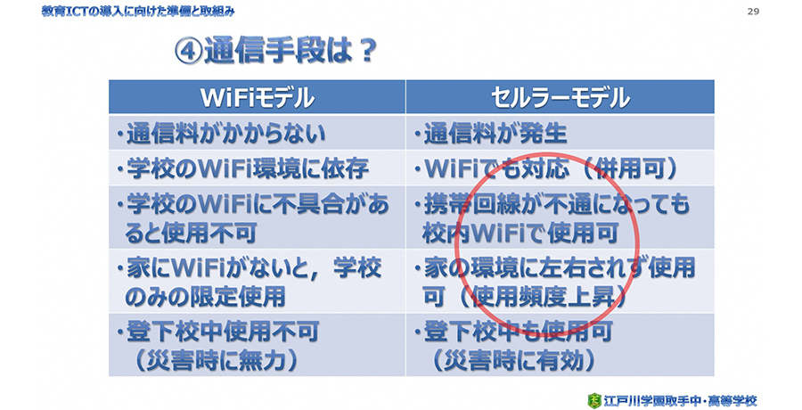 Wi-Fiモデルにするかセルラーモデルにするかの判断は、校内のWi-Fi環境は整備済みですが、学びを止めないという意味でも家族揃っての接続に耐えるWi-Fi環境がないご家庭がある可能性や、登下校時にも使用できる点、あるいは登下校時に災害が起きた場合などにも効力を発揮できるセルラーモデルを選択しました。
