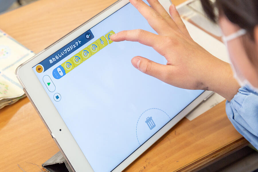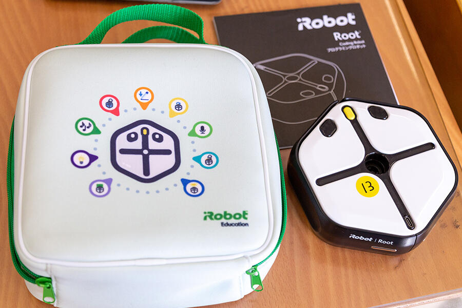 総合的な学習の時間で行なわれたのは、ロボットを使ったプログラミング学習。ロボット掃除機ルンバで知られるiRobotが作ったプログラミングロボット「Root」と専用アプリを使い、実際に動かしながらプログラミングを学んでいきます。この専用アプリは、動作が割り当てられたブロックをつなげるだけでロボットが動くレベル1から、本格的なコードを使ったレベル3まで用意されていて、段階を踏んで学ぶことができます。