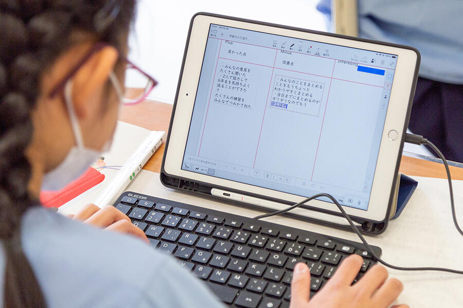 4年生を担任する浅沼教諭の国語の授業を見学させていただきました。この日は「言葉のタイムカプセルを残そう」という題材に対し、自分たちの係の仕事を振り返るという内容。児童は、MetaMoJi ClassRoomを使用し、浅沼教諭が配信したシンキングツールの表に記入していきます。ここでは、iPadに共有のキーボードをつなぎ文字を入力していました。