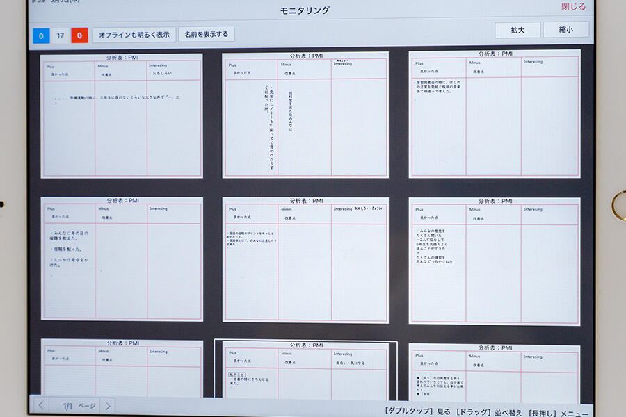児童に関することでは、MetaMoJi ClassRoomのモニタリング機能で全員の回答を見ることができることが大きいといいます。話すことが苦手な児童が発表する時に、他の児童が誘導してあげることで発表する力の向上につながることや、問題につまずいている児童が、他の児童の回答からつまずきの原因を解消するなど、児童同士の協働がうまく機能しています。