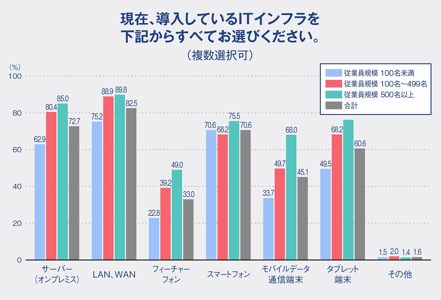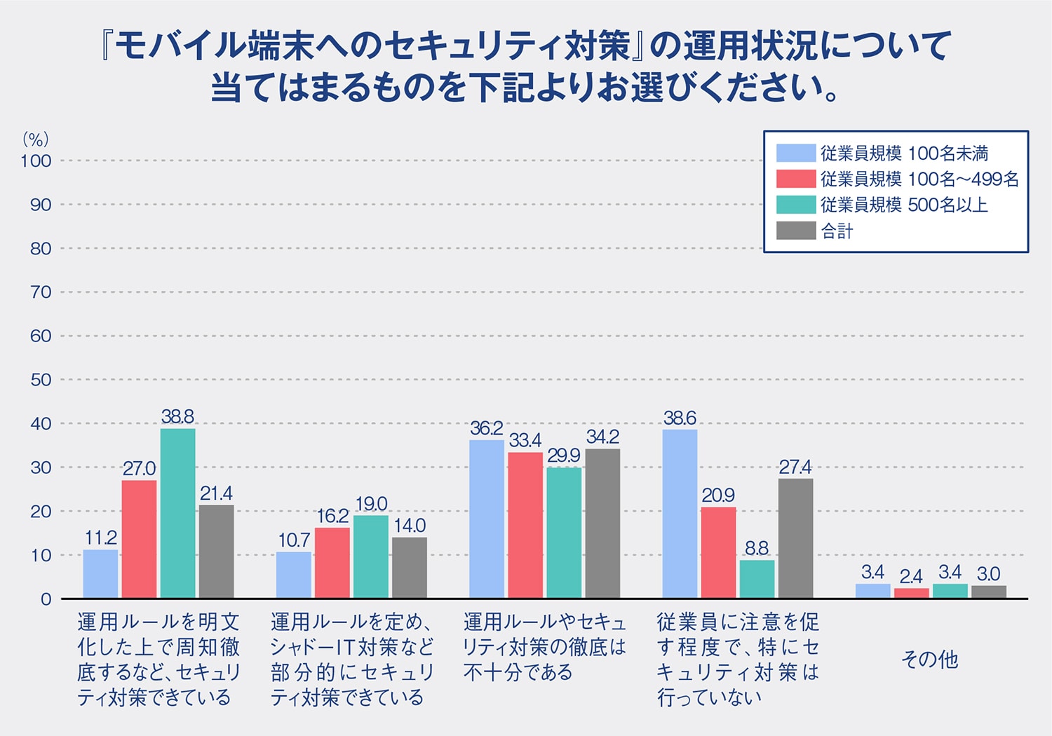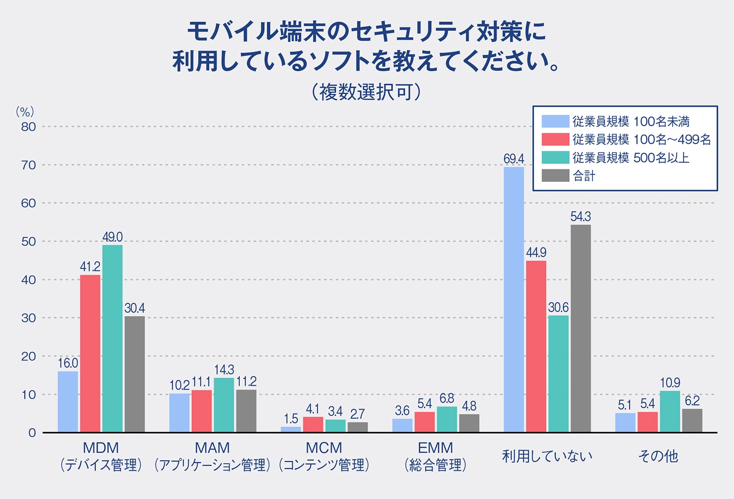 もちろん、この回答だけを見て『全くセキュリティ対策をしていない』と断言はできませんが、スマートフォンなどのモバイル端末では、MDM (モバイルデバイス管理) などのソフトを利用することが一般的です。この結果からセキュリティへの取り組みという点では従業員規模との相関があると言えます。