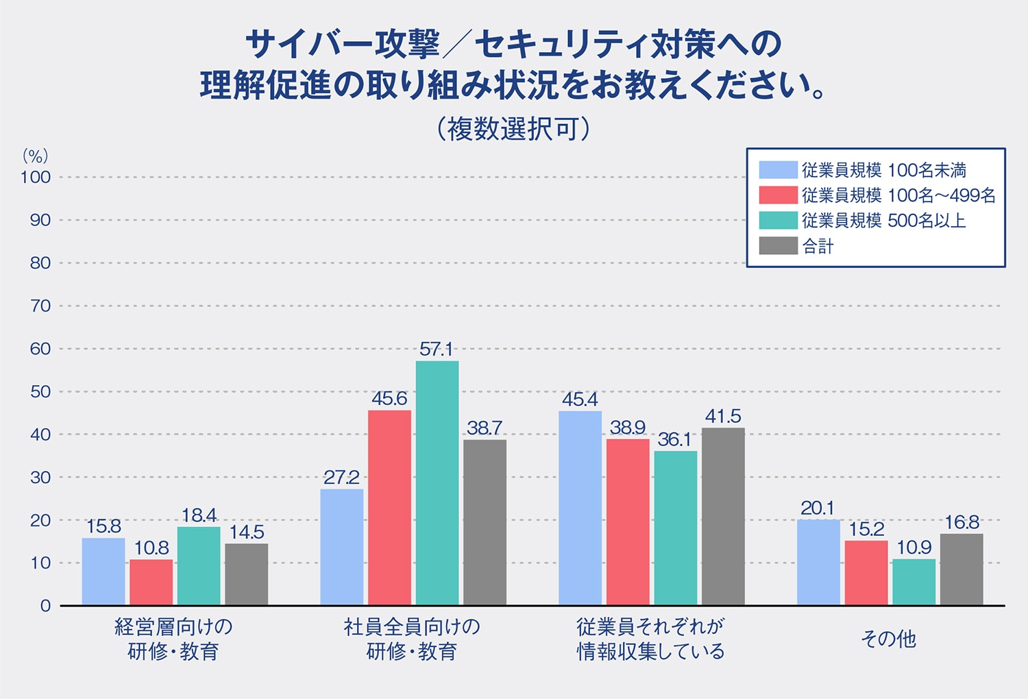 今回のアンケートで経営層へのセキュリティ研修は、すべての従業員規模層で20%以下という結果が出ました。 経営層に十分な研修が行われない理由は『時間がない』『セキュリティ対策は社員のもの』といった意識があるためかもしれません。しかし、経営者だから、役員だからスマートフォンを使わない、紛失しないということはないはず。むしろ、一般の社員よりもアクセス権限が大きい経営層こそ、紛失した場合のリスクは大きいのではないでしょうか。そのため一般の社員以上にセキュリティ研修を義務付けるなどの対策が必要です。