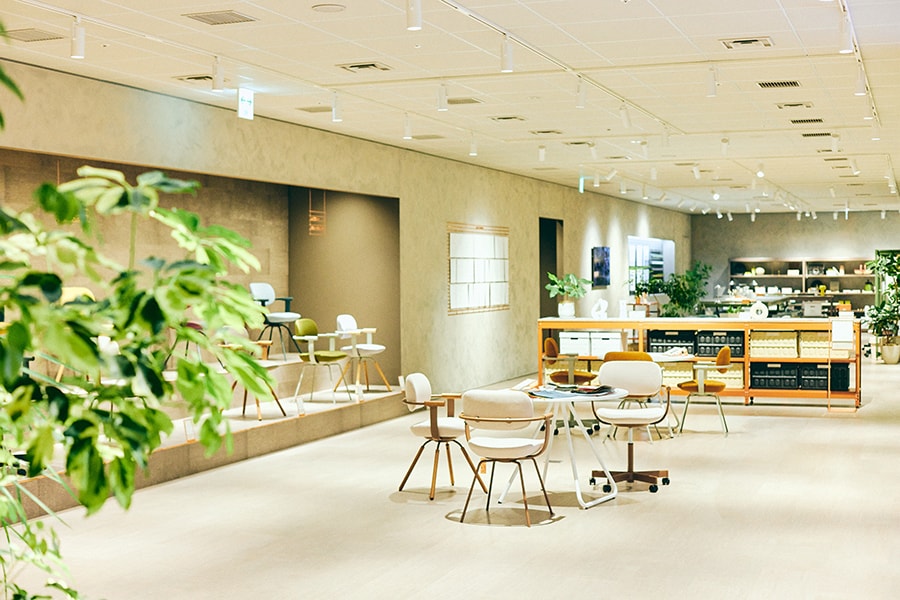 商談が活動として重要である場合は、ショールームとワークスペースを隣接させて、ショールームで製品を見た後に、そのまま商談を行うレイアウトを取り入れるパターンもあります。写真はイトーキ社の例です。ほかにもお客さまと一緒に食事ができる社員食堂を設けている例などもあります。