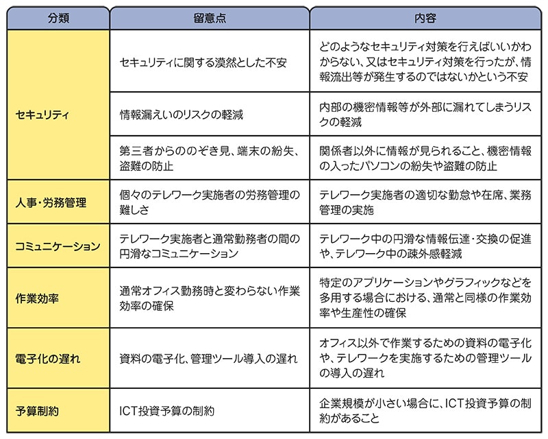 厚生労働省は、テレワークの整備にあたり、6つの分類とぞれぞれの留意点や内容をまとめています。