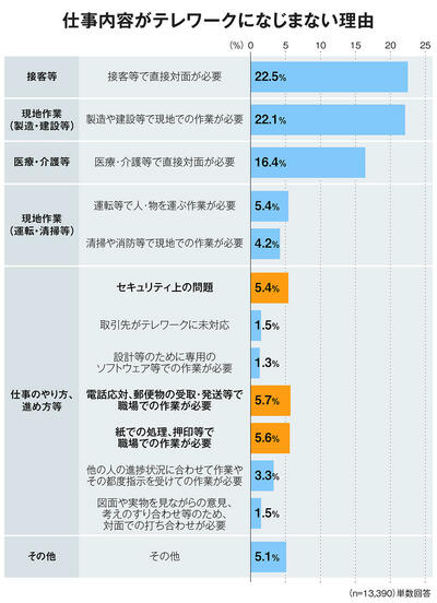 2010年頃の働き方改革から緩やかに増加していったテレワークは、コロナ禍への対応策として一気に広がりました。しかし、テレワークが可能な職種であっても、別の制約によりテレワークが難しいケースがありました。その代表格が管理部門です。国土交通省が2022年に公開したテレワーク人口実態調査でも、仕事内容がテレワークになじまない理由として、セキュリティの問題や紙・押印の処理が上がっていることからもそれは見て取れます。
