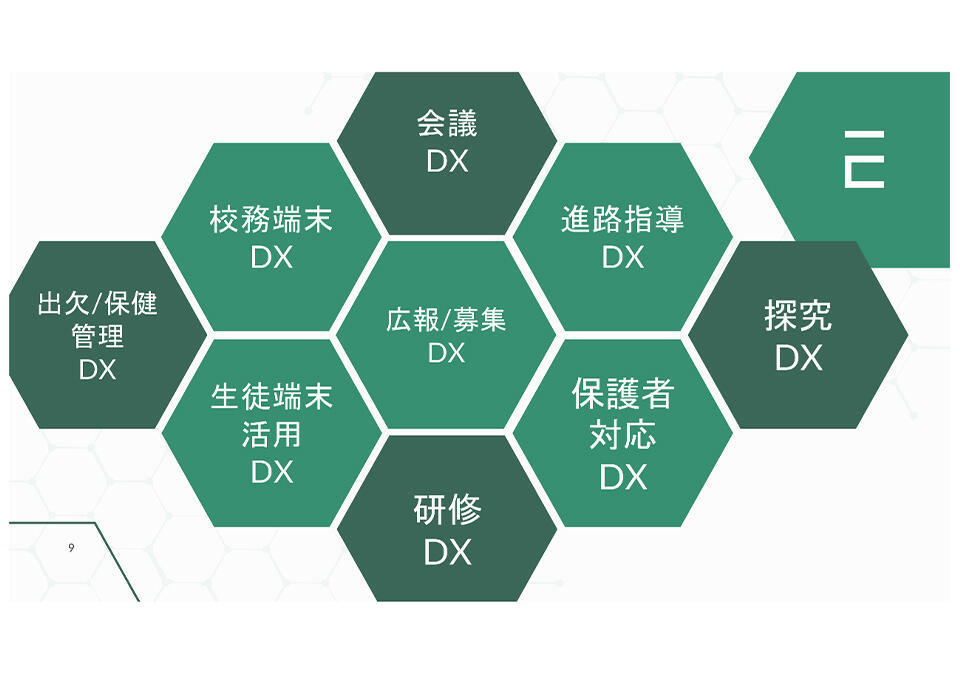 野本氏は講演の冒頭で、学校の魅力向上や経営効率化を含む「DXのポイント」として、全9項目の論点を提示した。