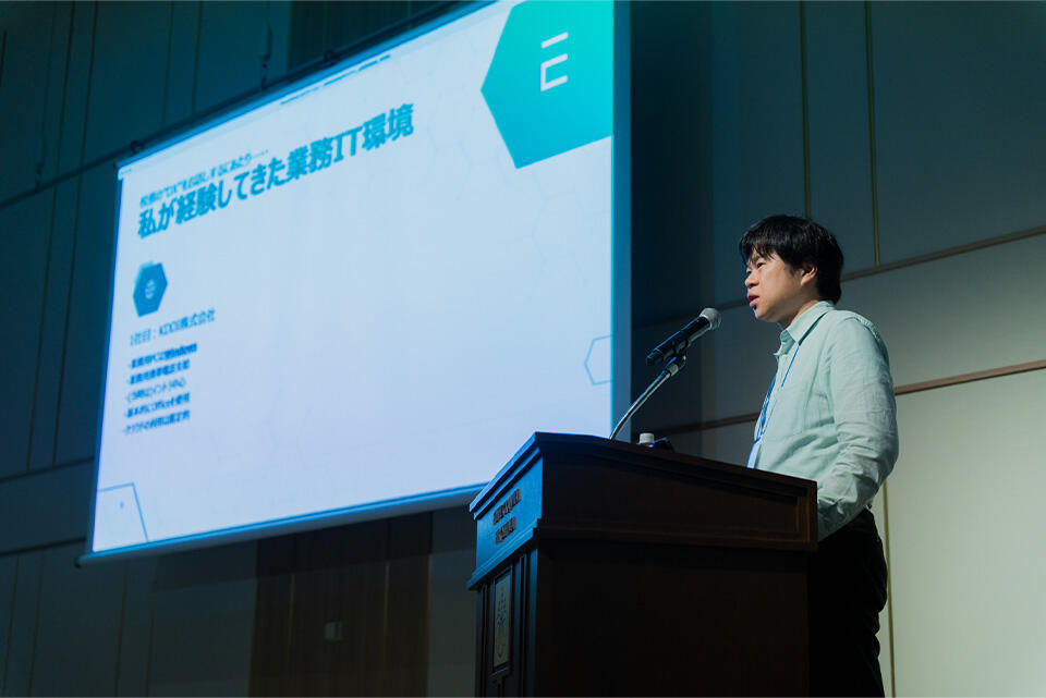 前提として自身が経験してきた業務IT環境を説明する野本氏
