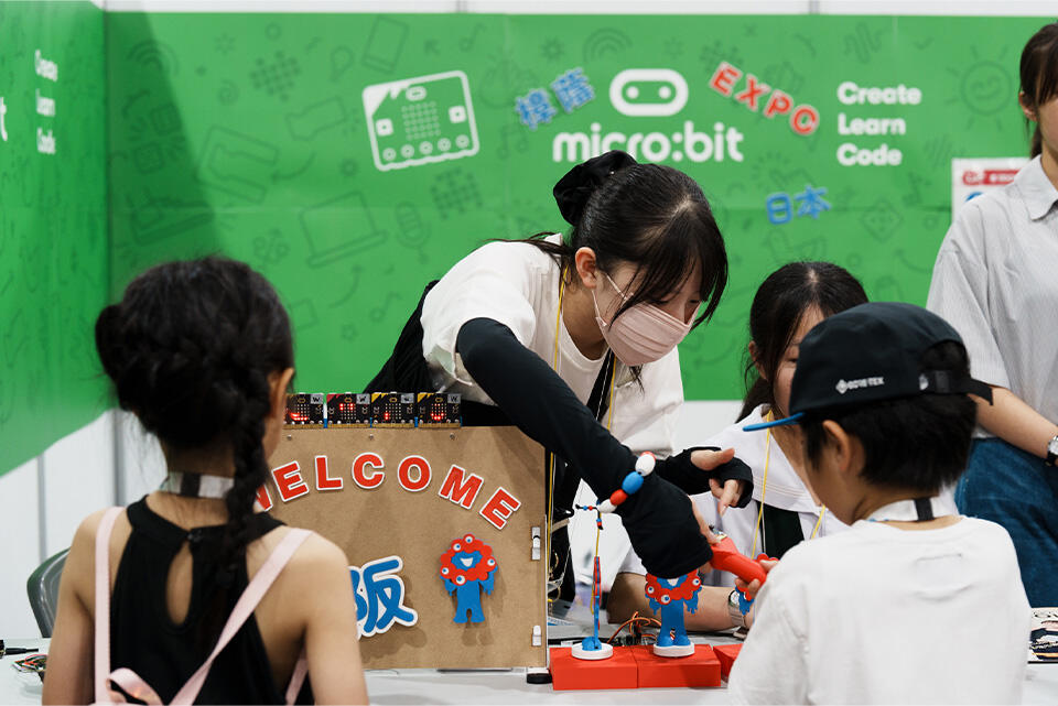 最後に、EXPO2025 大阪・関西万博での展示発表の活動を紹介。マイクロビット教育財団のオファーを受けて、高校2年生2名と中学3年生3名、計5名のチームで行った探究活動の内容を説明した。