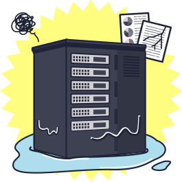 C社の場合異常気象による集中豪雨で河川が氾濫、川の近くに事務所を構えるC社は床上浸水の被害を受けた。社内に設置されていたサーバーや非常用のバックアップハードディスクもすべて浸水し、利用不能な状態に。経理情報や業務資料を含むデータの復旧は絶望的で、社員が持ち帰っていた数台のノートパソコンに残っているデータだけでは事業を再開することは難しそうだ。