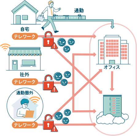社内外のさまざまな経路からアクセスされることにより、セキュリティリスクが高まります。