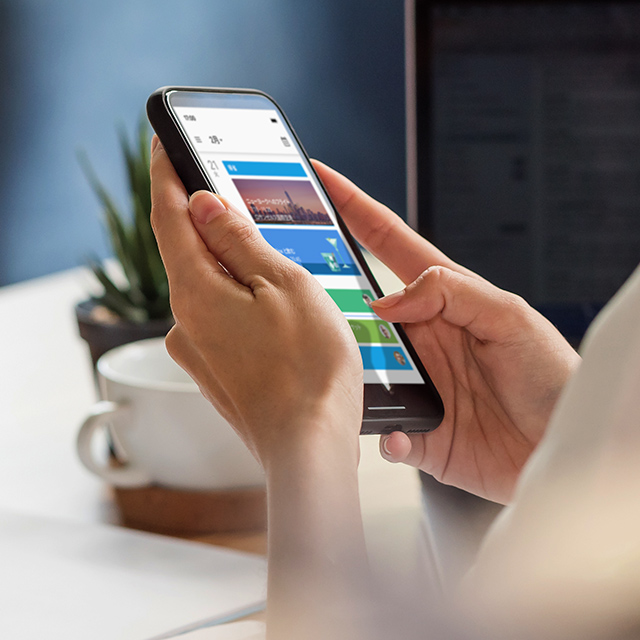 メールの送受信や、スケジュール管理・資料の確認/編集・ファイル共有などのオフィスで行う日常業務を、スマートフォンやタブレットを使って、外出先やお客さま先でも行うことができます。これにより、一人一人の業務スピードが向上するとともに、わざわざ帰社する必要もなくなり、ムダな残業時間の削減にもつながります。