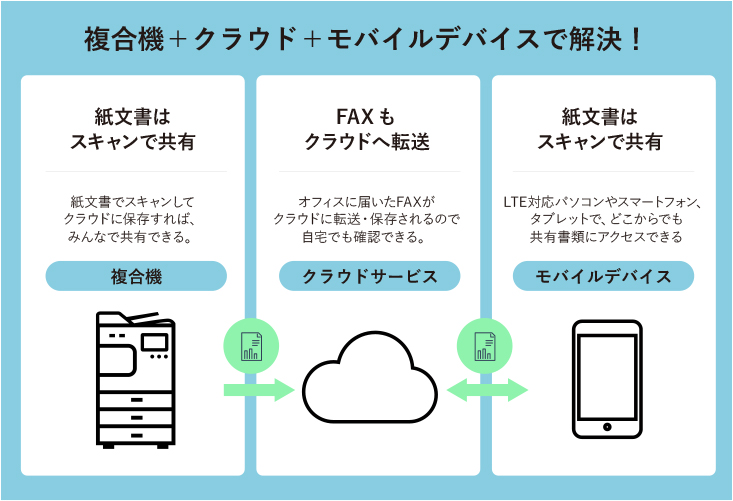 代表電話からの内線は、そのまま携帯電話に転送してくれるサービスを使えば、会社に出社していなくても応答することができます。また、会社に届くFAXも、複合機とクラウドを活用すればオンラインで送受信ができるので、外出先や自宅からでも速やかに対応することが可能になります。
