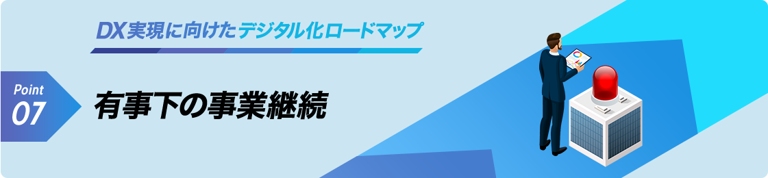 デジタルデバイスとクラウドサービスの導入によって業務のデジタル化が進んだその先にあるのが、このステージです。自然災害など、もしものときに業務をどうやって継続するのか、経理や総務、人事といったバックオフィスの業務は大丈夫か?データは安全なのか?といった、備えに必要となるソリューションと、新しい働き方にあわせたオフィスの形について確認しましょう。
