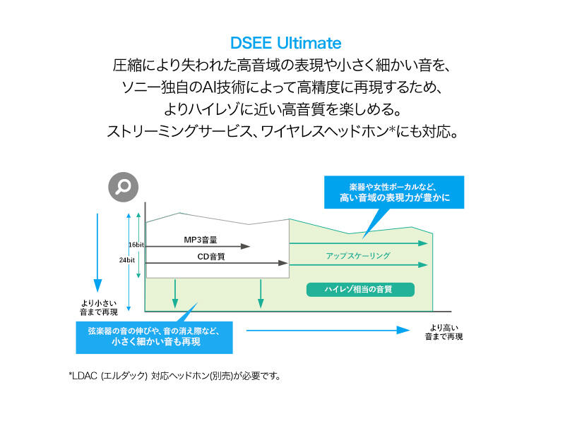 - ※1 DSEE Ultimateの設定ON時に有効です。ハイレゾ相当の音質で楽しむにはハイレゾ対応ヘッドホン(別売)が必要です。